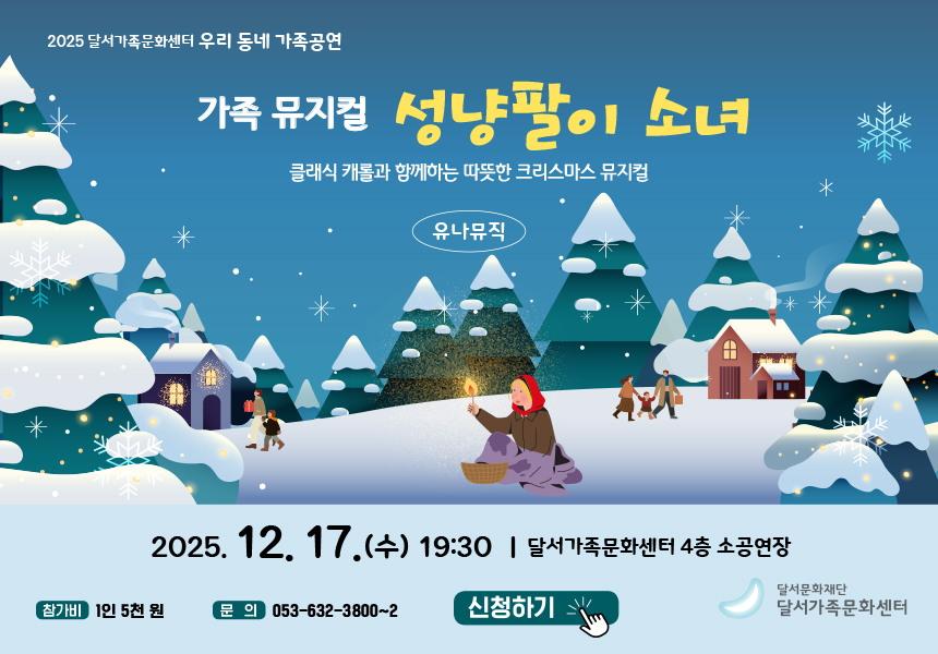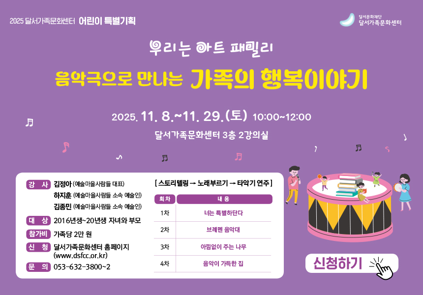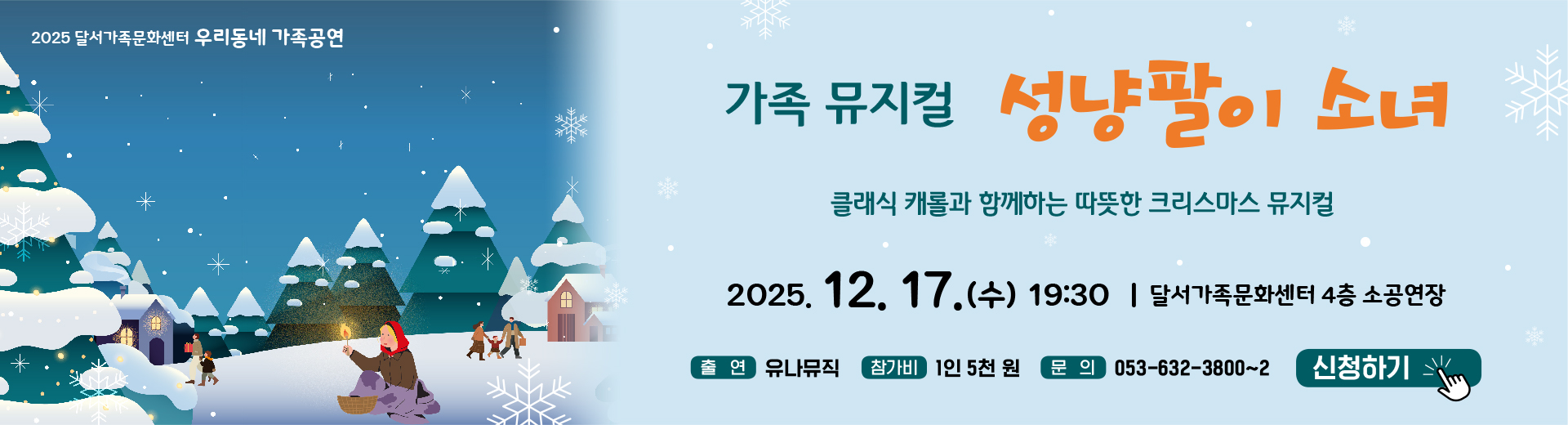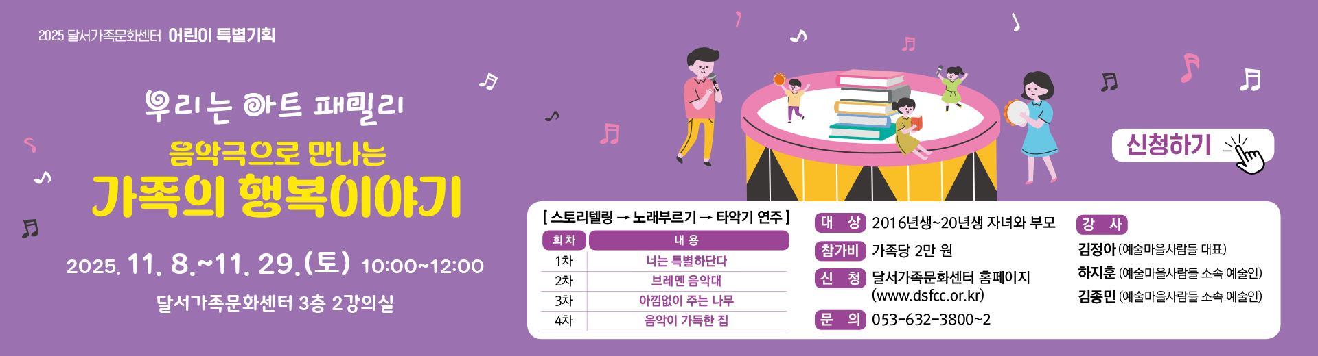 센터 소식 more 2025 달서가족문화센터 가을·겨울학기 수강생 모집2025.07.25 [달서구청]부모공감토크: 나의 행복한 결혼, 행복한 가족2025.06.09 2025 달서가족문화센터 여름학기 수강생 모집2025.04.28 2025 달서가족문화센터 문화강좌 강사 모집 최종 합격자 공고2025.03.28 빠른 메뉴 E-Book 가족친화 수강신청 문화강좌 수강신청 온라인신청 가이드 행사일정 오시는 길