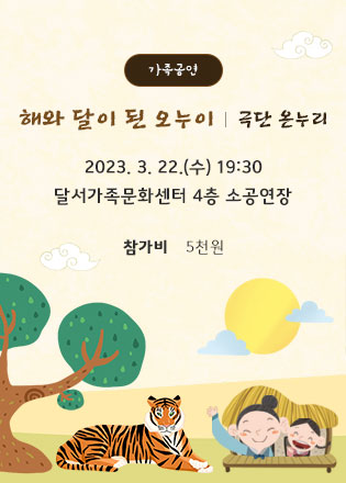 해와 달이 된 오누이 관람 위주 방식에서 벗어나 유대감과 공동체 의식을 느낄 수 있는 체험형 프로그램. 감상과 호응단계에서 벗어나 극의 시작부터 어린이들과 함께 노래하며 이야기를 인식하게 하고 극의 새, 나무, 고개, 산, 떡 등 직접적인 이야기 속의 참여로 이야기를 풀어나가고자 한다. 어려운 상황에서도 희망을 잃지 않은 오누이의 지혜와 용기를 어린이에게 느끼게 해준다. |