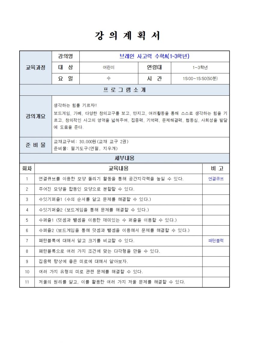 수리 신청마감[어린이]브레인 사고력 수학A(1~2학년)(중도수강)