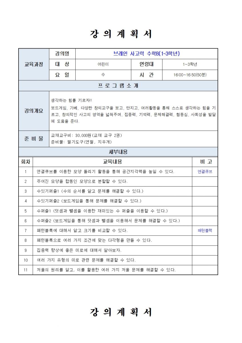 수리 신청마감[어린이]브레인 사고력 수학B(1~2학년)(중도수강)